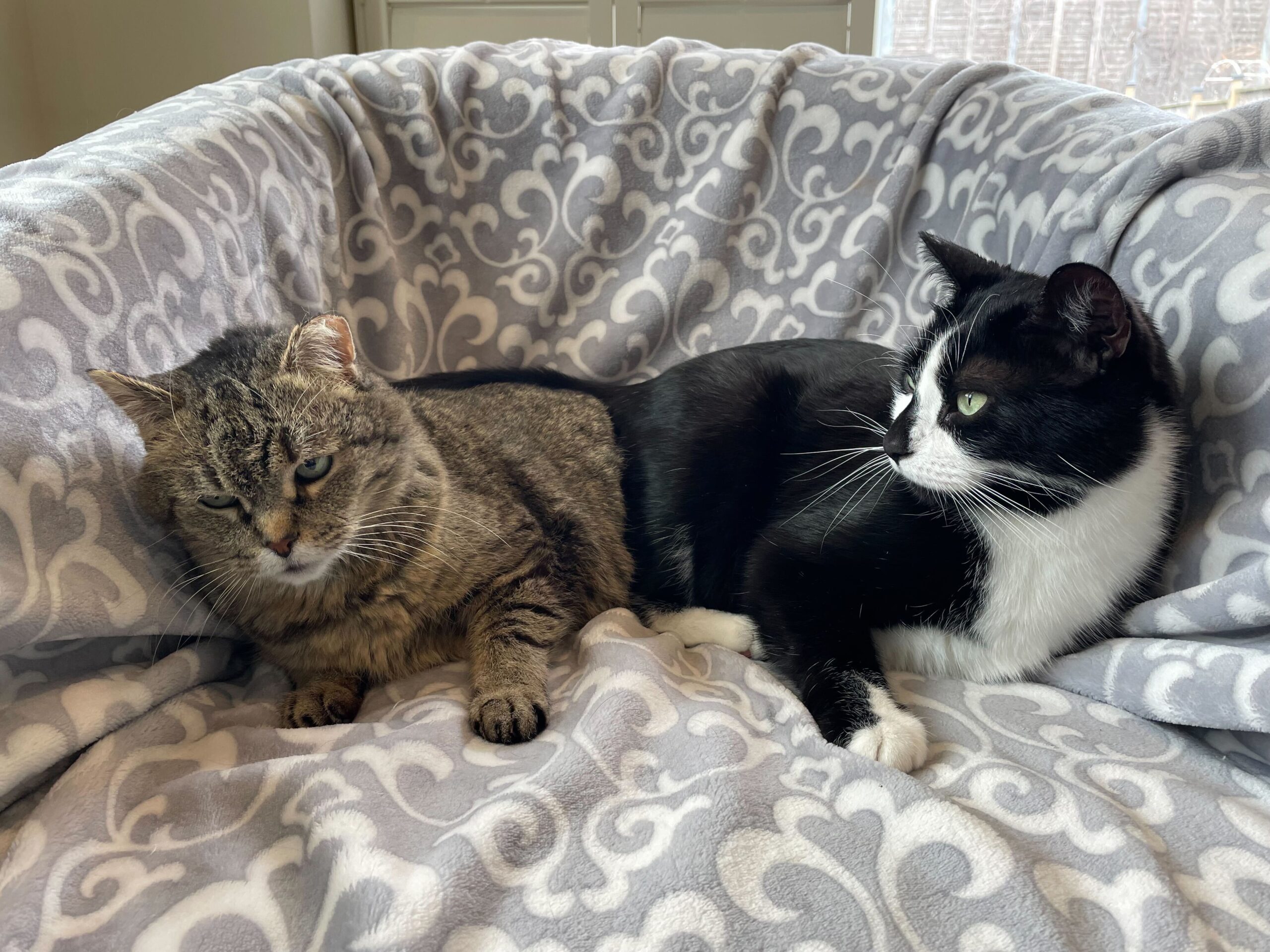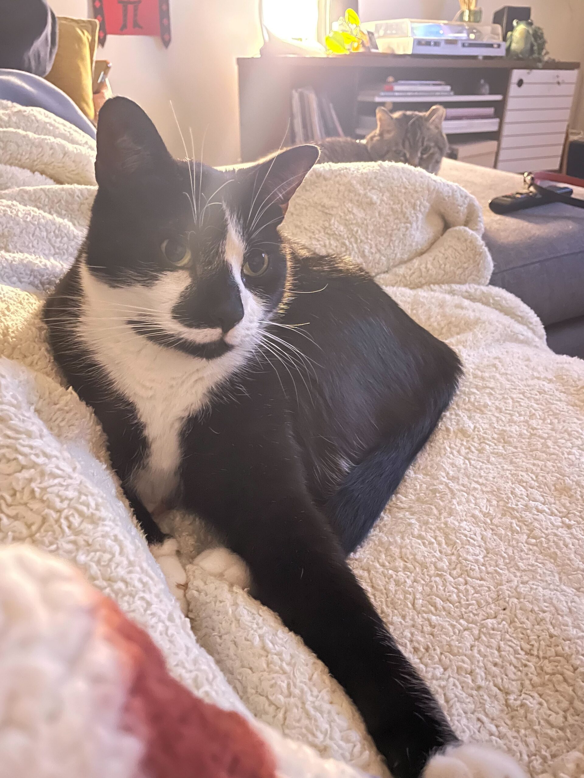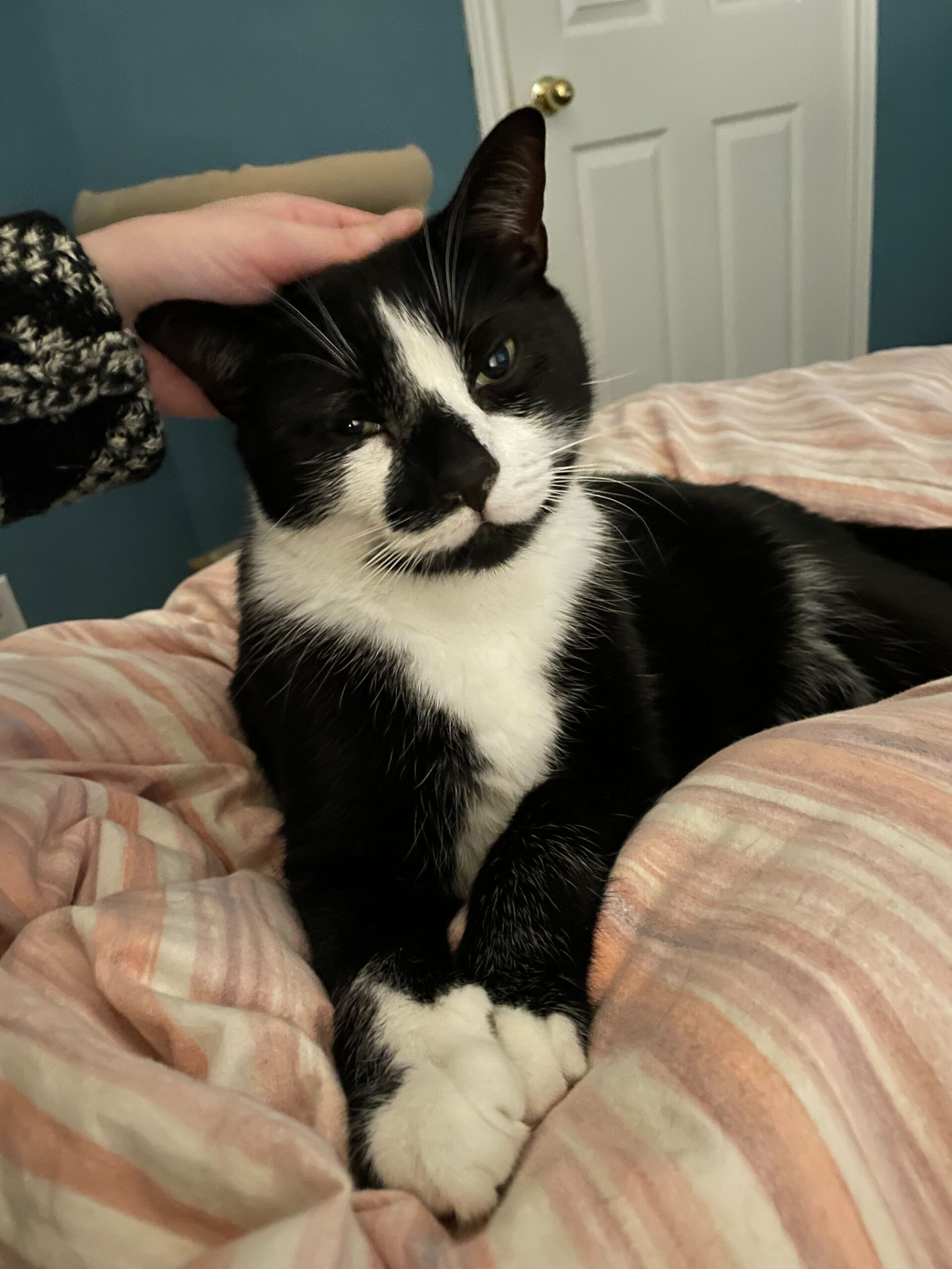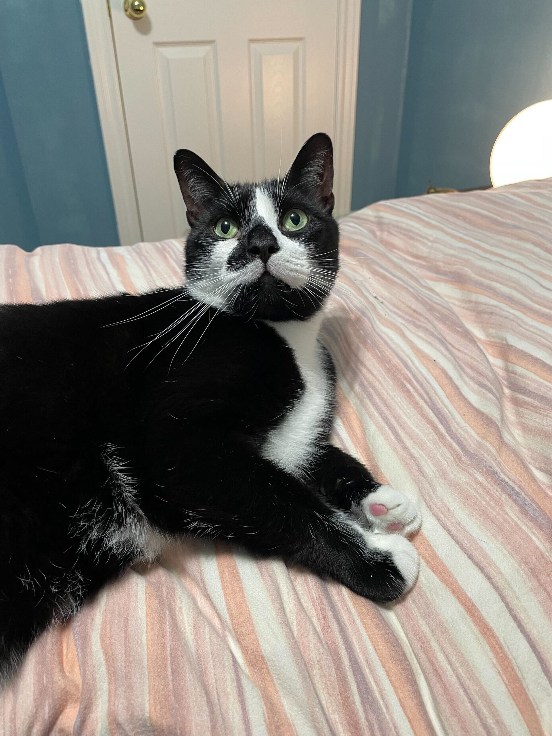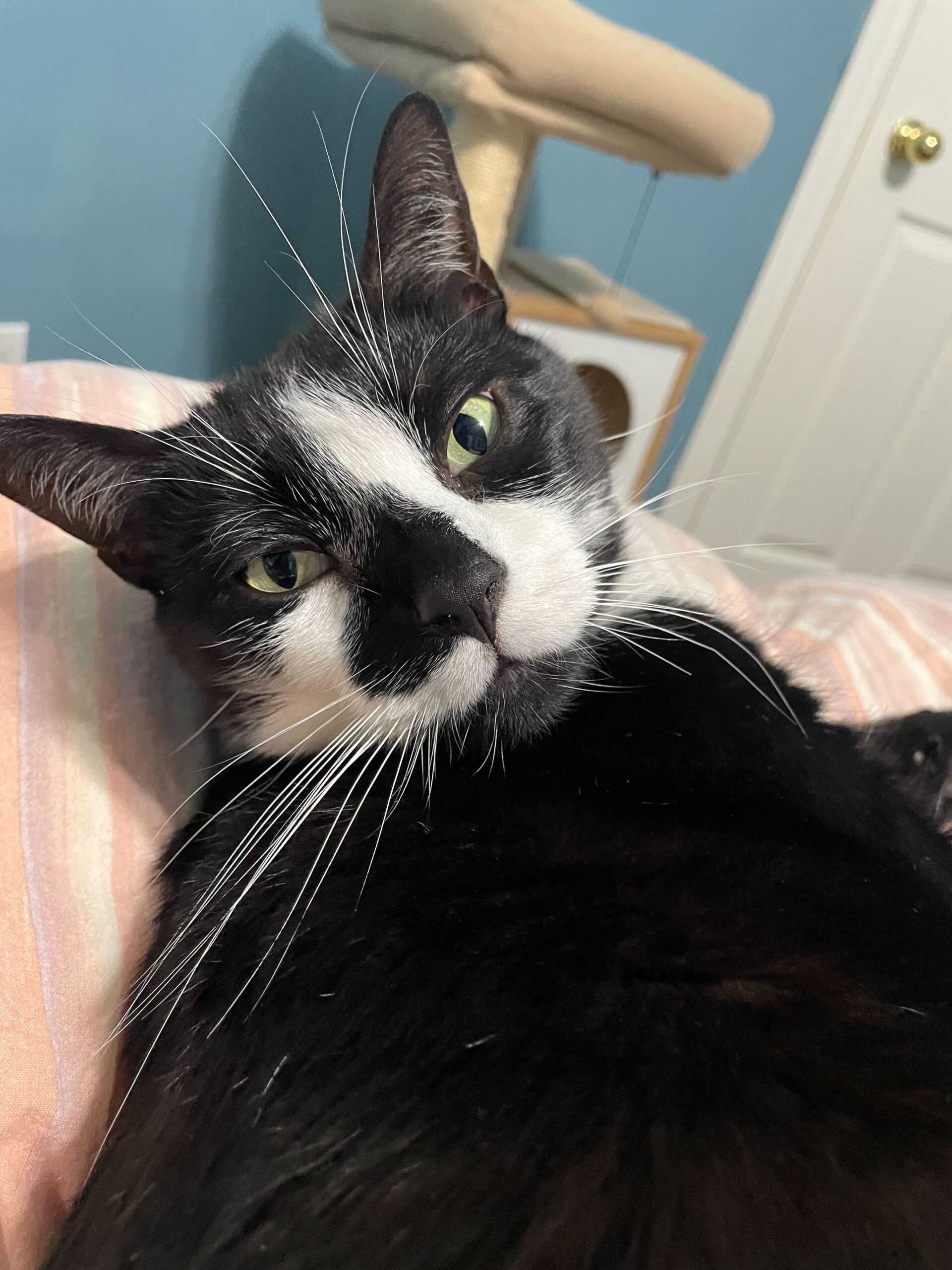He is a very loving angel who cares for you by being all over your personal space because he just loves snuggling. Whenever he is ready for a nap, he finds the first human in sight and lays directly on top of them. He does not settle for less… he must be as close to you as possible because humans are the perfect cushions for a big fella like him! Additionally, he enjoys a good catnip toy, as well as sitting by the window for some birdwatching on a nice sunny day.