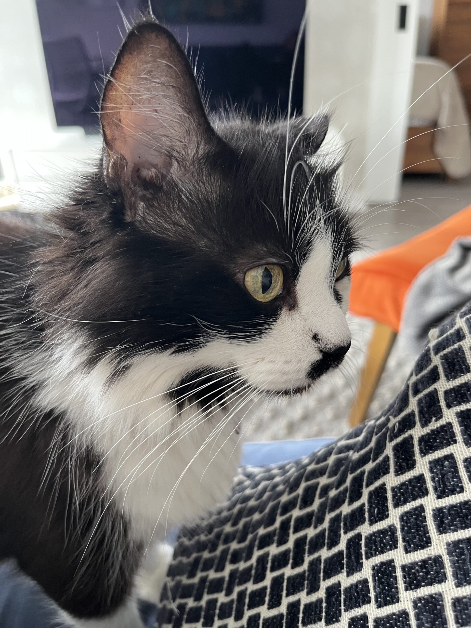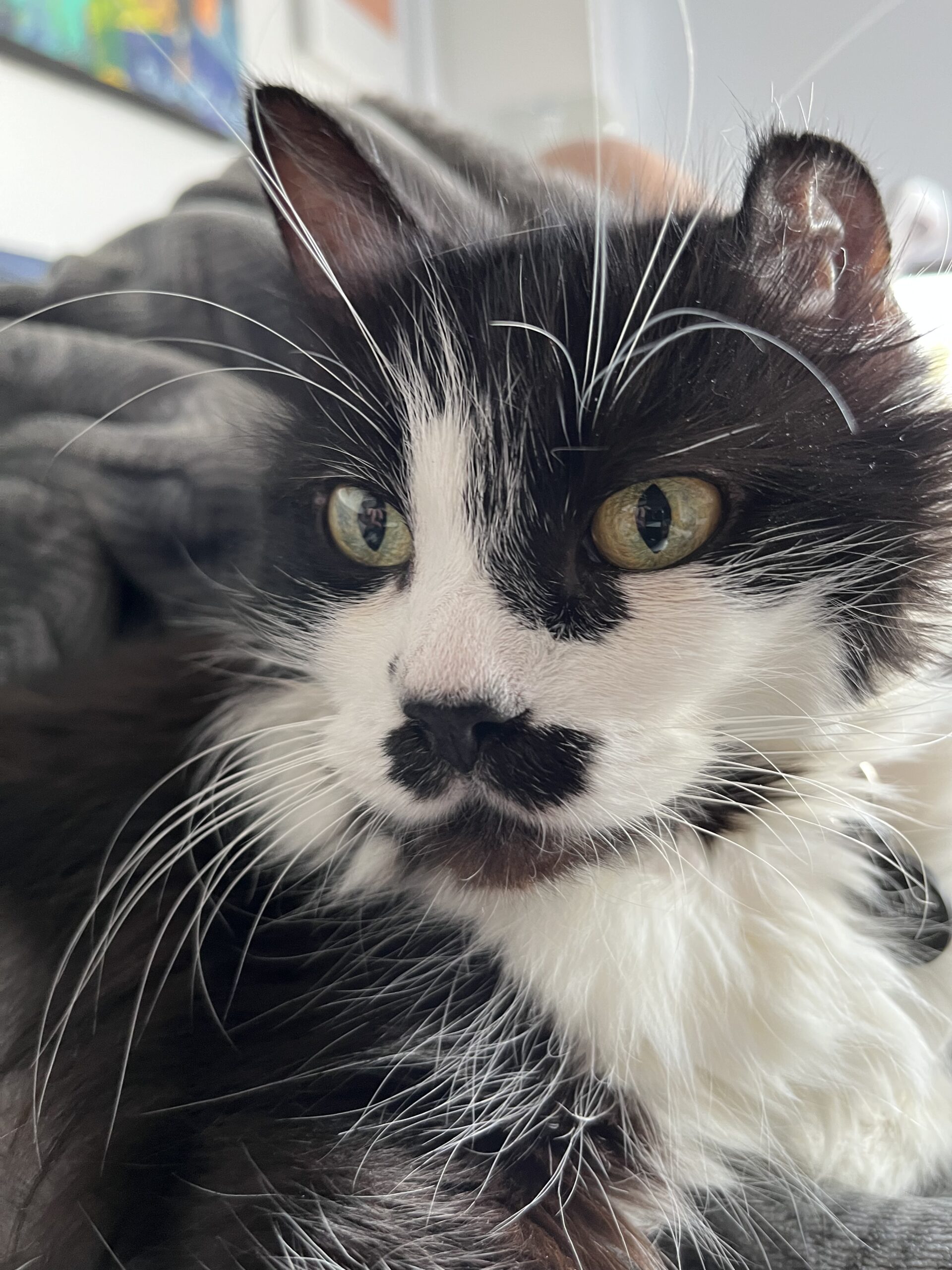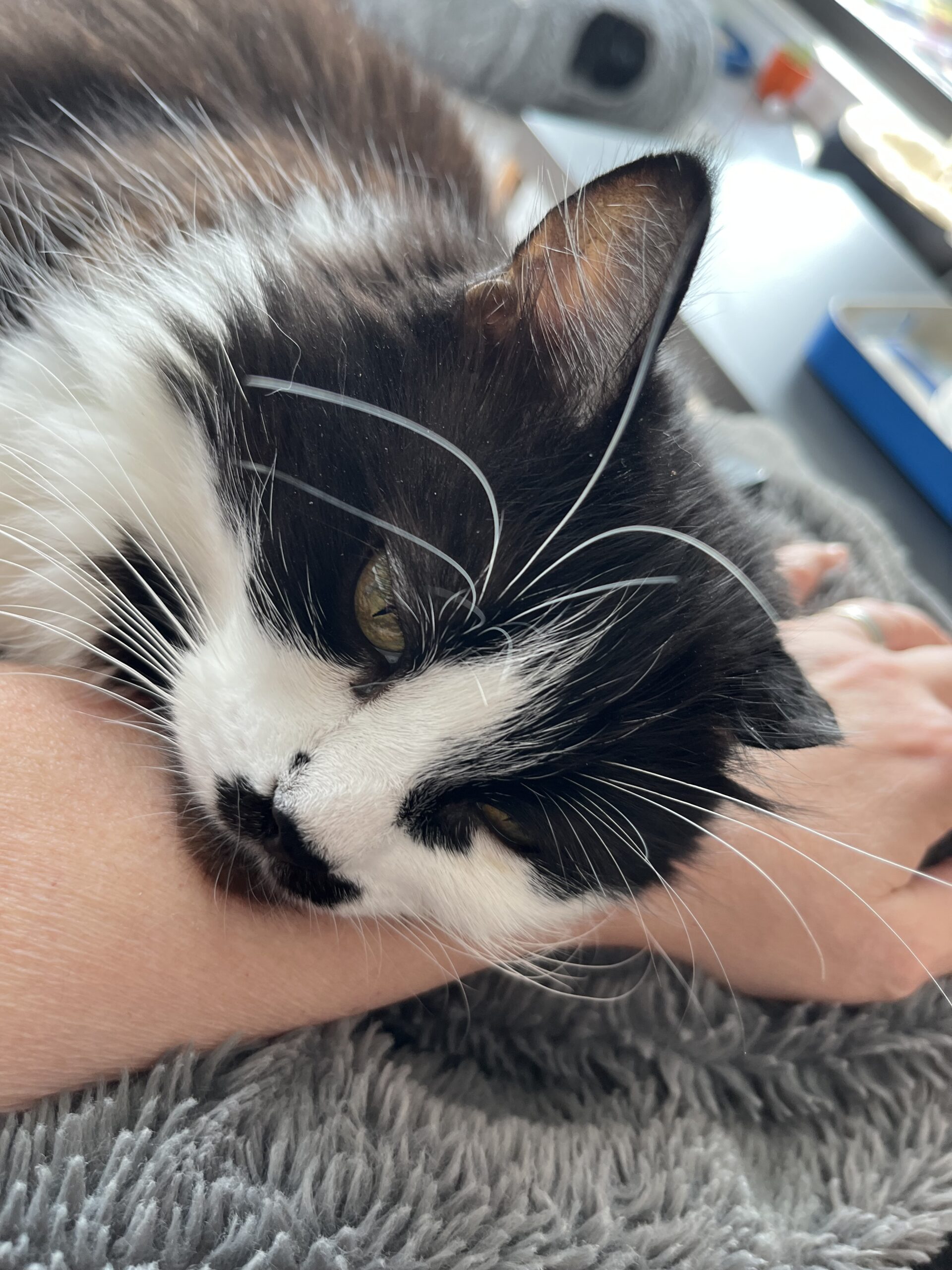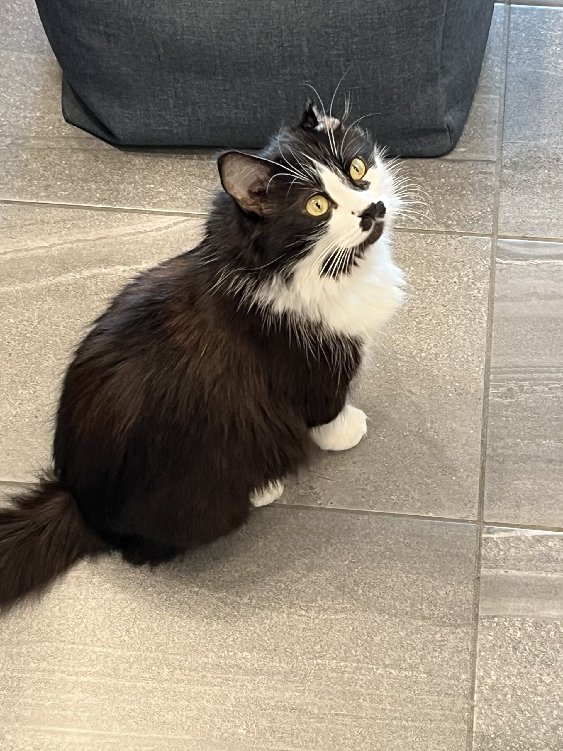 Felony enjoys being brushed, petted, and picked up — anything that involves close contact with her human. She’s quiet and gentle, with the occasional soft and adorable meow just to remind you she’s there. While she's not big on ground toys, she’ll happily play with a wand toy when the mood strikes. She loves wet pâté food and snacks on her dry food throughout the day. Her litter box manners are excellent although she does have a flair for dramatic litter kicking. Her foster has found that a high-sided, deeper litter box keeps her digging confined to the box and not the floor! Felony has not been tested with dogs or children but has been friendly with some cats.