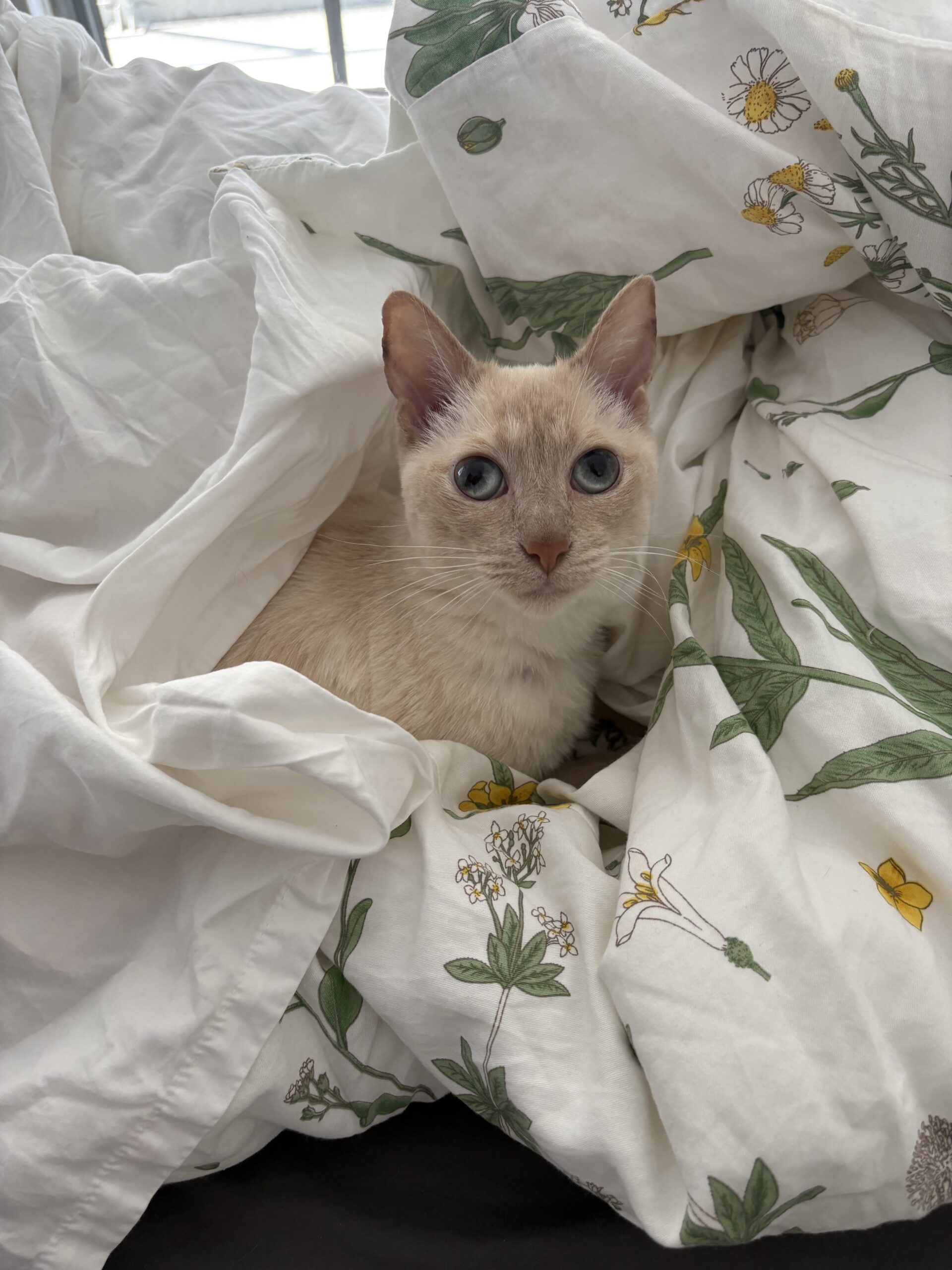 Shortcake is the sweet, feminine soul of the duo who has mastered the art of quiet devotion. This gentle girl has the most endearing bedtime routine: she'll follow you to bed each night, ready to snuggle under the duvet while you read or relax. Though she's not a lap cat, she's open to hugs, pets, and being held (at least for a little while!). Shortcake is patient, loving, and content to simply share your space, offering her peaceful presence as companionship. She's also been known to enjoy her meals a little too much, occasionally sneaking bites from her sister's bowl!
