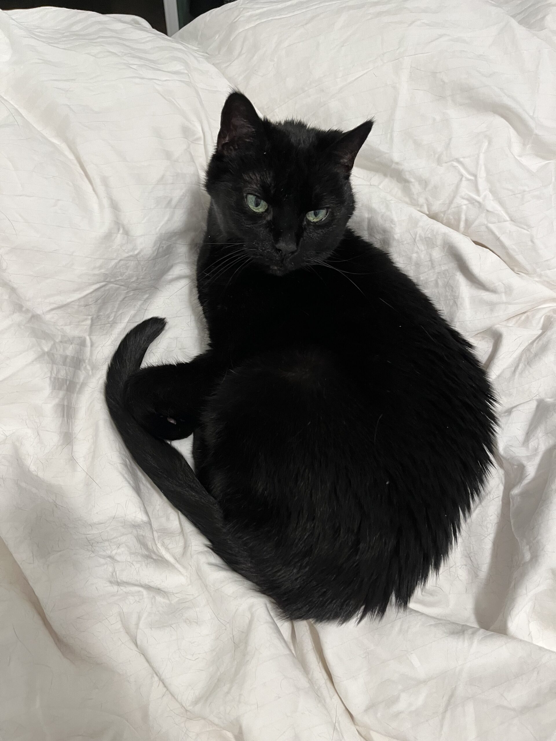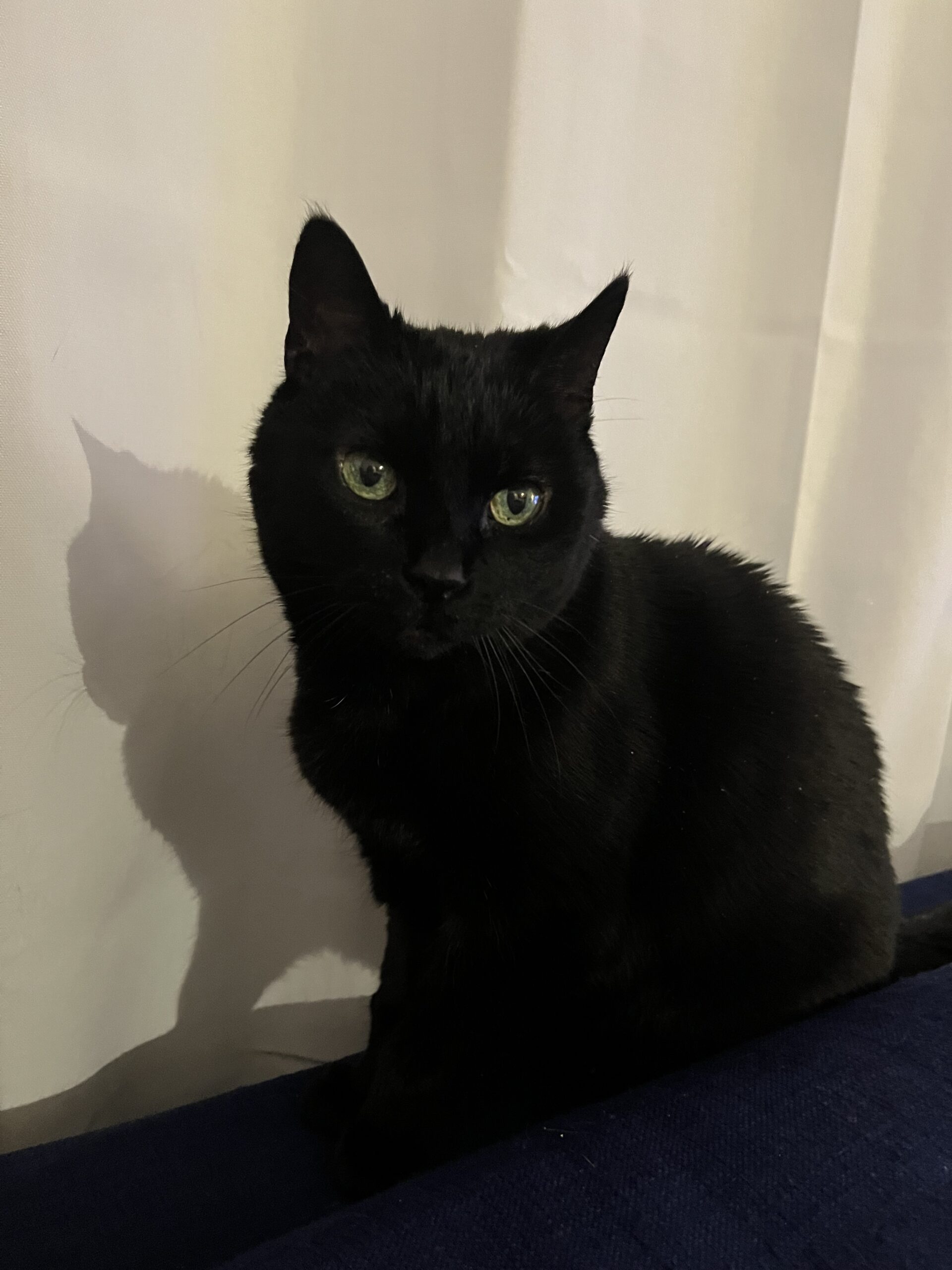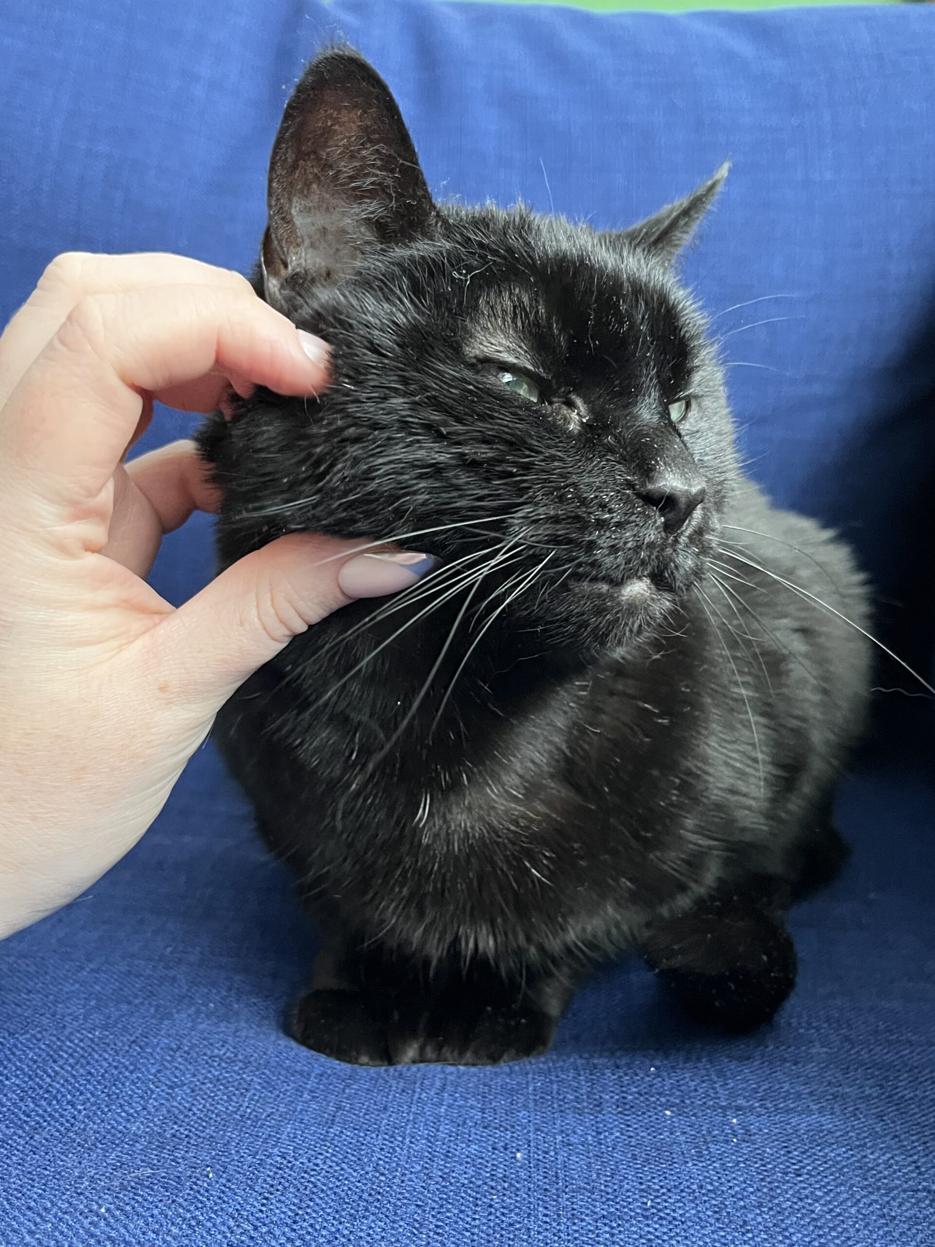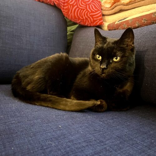 To help Midnight stay relaxed, we think she’d do best in a quiet home with chill humans. She gets startled by sudden noises and loud outbursts, but despite that she is known to warm up to her people quickly! Midnight hasn’t been tested with dogs or children but she is good with other cats.