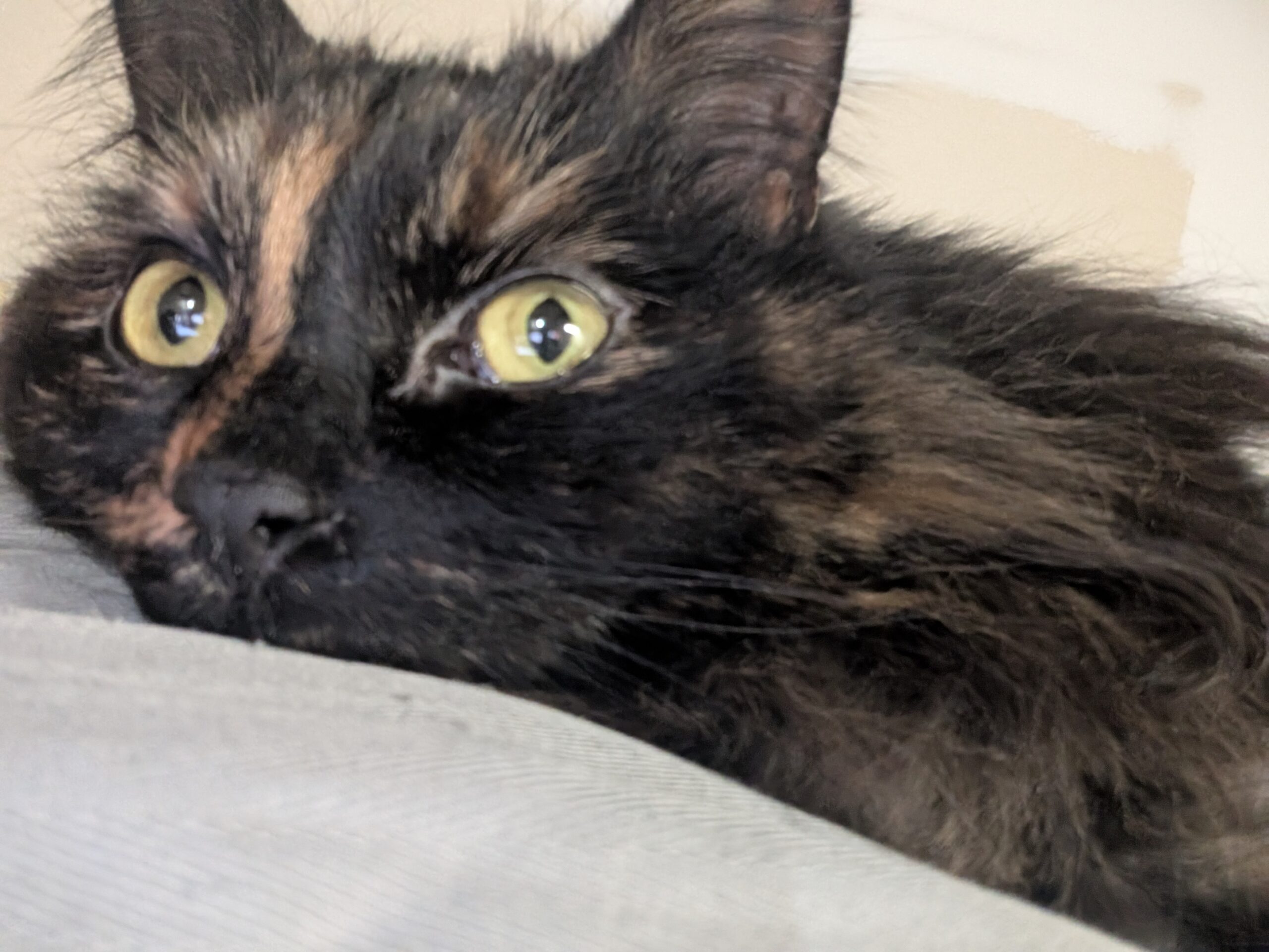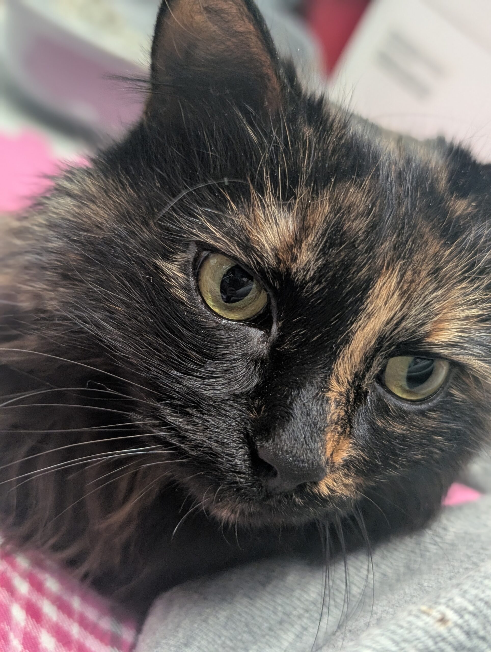 Meet Penny! If you’ve been dreaming of a cat who will stick by you, your wish has been granted. Penny is an insatiable cuddle connoisseur who would happily be attached to her human 24/7 – unless a snack is in question! She’s head-over-paws for affection and needs a fur-ever home where she feels loved and protected. Penny’s love language is full-contact snuggling! She would cuddle you all day if she could.