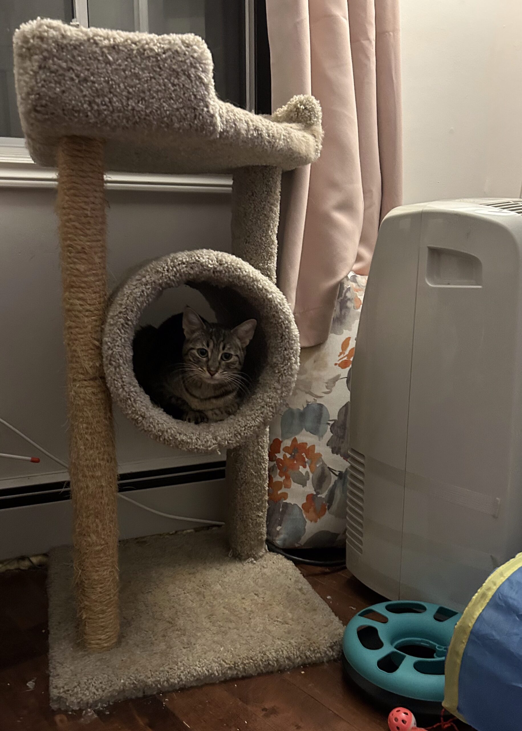 When Sassy Pants feels comfortable, her personality begins to sparkle! She’s a playful girl who loves to carry her toys around proudly, meowing as if to show off her latest “catch.” Her favorite quirky pastime? Watching cat videos that feature meows. She’ll come right up to listen if you play some on your phone and sometimes even curl up on the bed for a cozy catnap nearby. She’s a sensitive soul who prefers a calm, quiet home where she can take her time blossoming at her own pace. As the days go by you will see increasingly sweet glimpses of the affectionate kitty she’s destined to be.