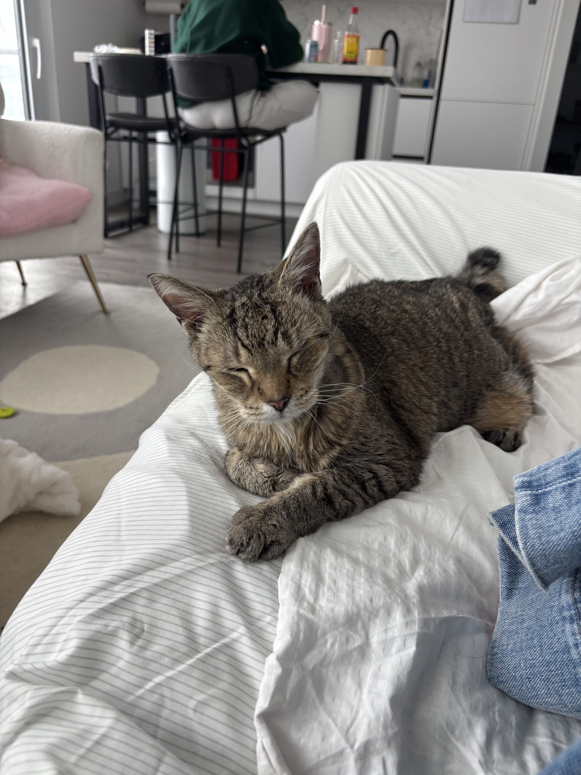 The Sir adores temptation treats and isn’t afraid to vocally tell you that he wants more of them over his boring dry food. At night, he often will do his last crucial task of making biscuits and will fall asleep while kneading. Sir Puffington has not been tested with children or dogs but does like some cats. He is so ready to find his forever home. If this wonderful soul sounds right for you, please contact Team Cat Rescue today!