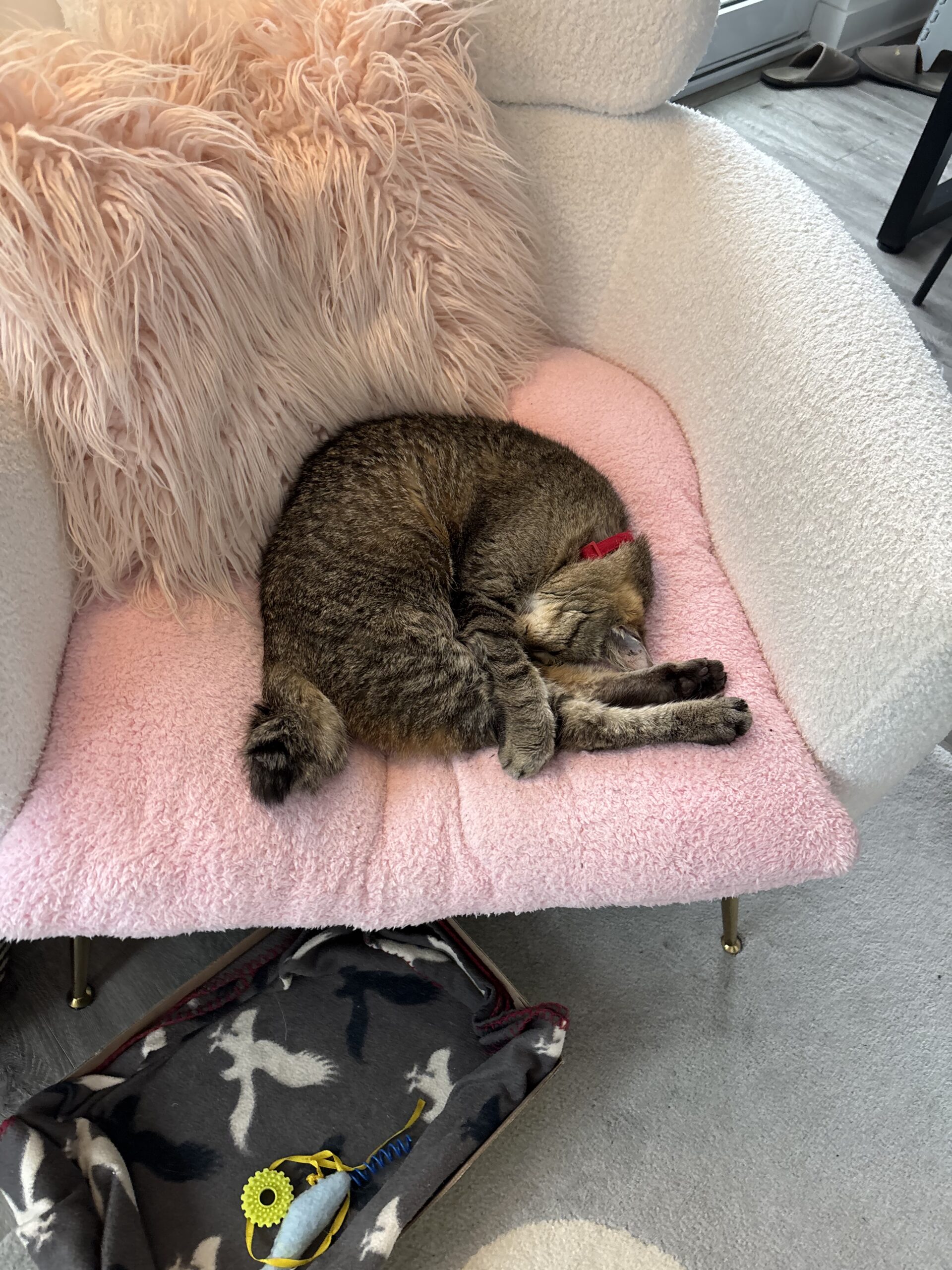 Sometimes this sweet older gentleman may need help being lifted onto the couch or the bed with you. He has no problems jumping down on his own, but he can’t jump very high, so he would be very appreciative of a stool next to his favourite spots or a little help to up get there! He will probably meow to let you know he wants up. He absolutely adores sleeping on pillows and loves to share the pillow of his favourite people while they sleep at night. He is also a lap cat and loves to sit on your lap while you read a book or watch TV.